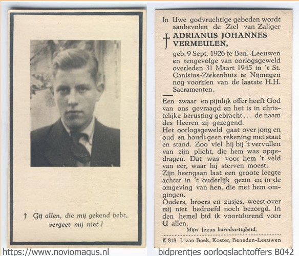 Adriaan was in september 1944 juist 18 geworden. Veel jongemannen moesten in Duitsland gaan werken, maar hij ontsprong vanwege zijn leeftijd net de dans. Adriaan was een zachtaardige jongen, zo weet Annie zich te herinneren. Hij was doorgaans veel te goed, maar kon ook wel eens kwajongensstreken uithalen. Hij zat niet stil. Ging overdag helpen bij oom Wim Vermeulen in Wamel. Die had een slagerij. Ook werkte hij bij Piet van der Zande, de bakker in de Schetsteeg, nu Beatrixstraat. En hij hielp op het eind van de middag vader bij het melkventen.