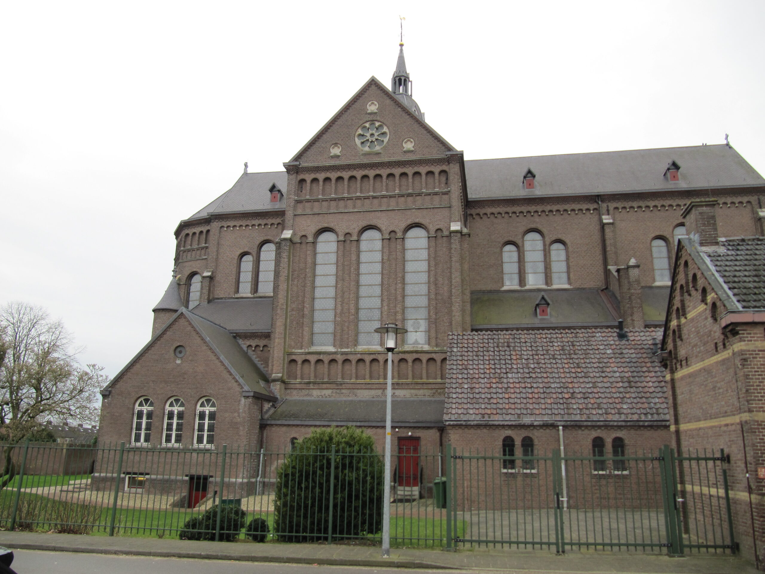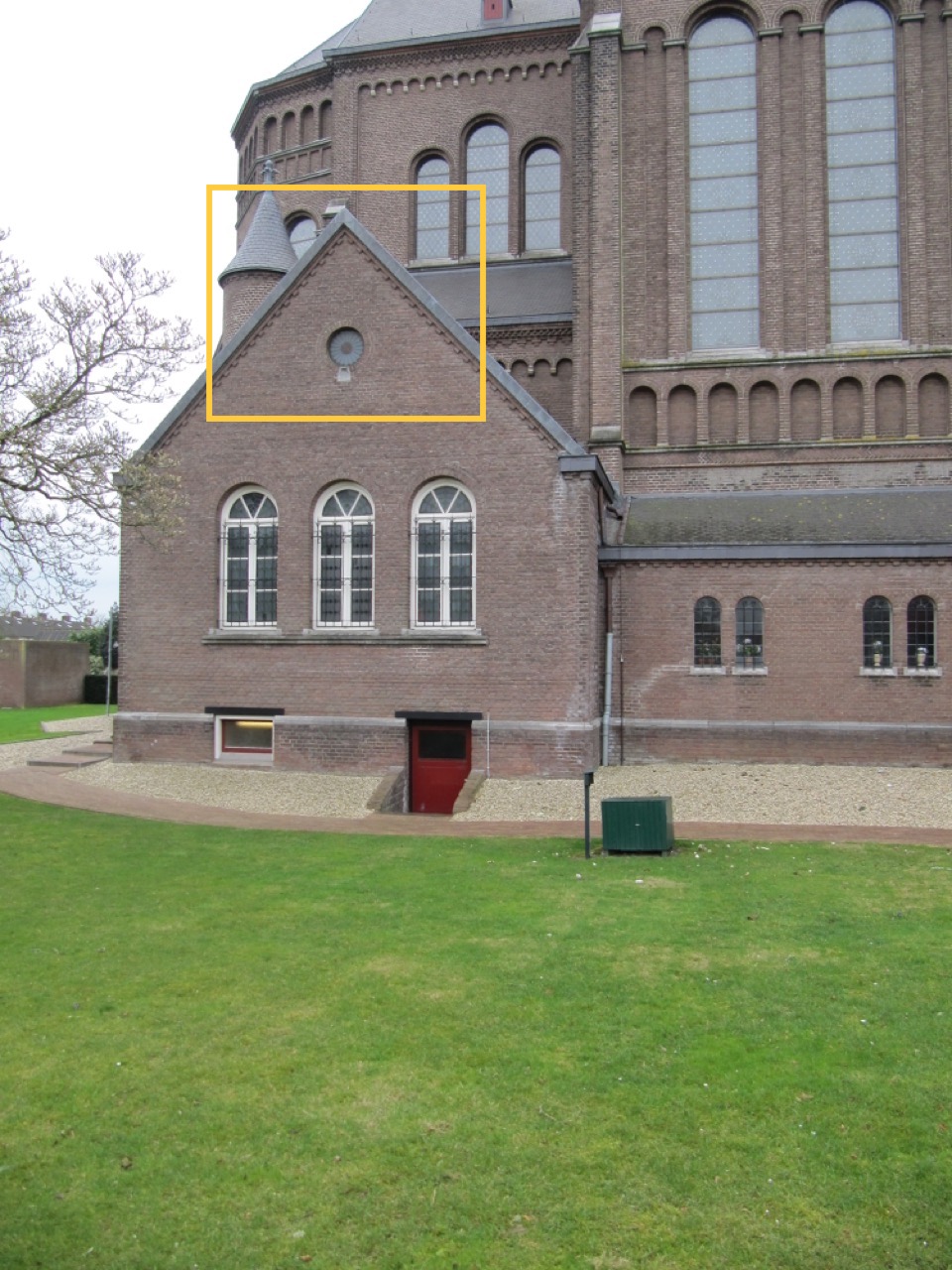 Vanuit deze positie kijkend naar de overkant van de Pastoor Zijlmansstraat is aan de zijkant van de kerk de toegang tot een kelder te zien.