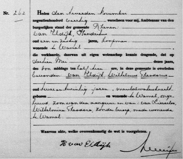 Op 5 februari 1918 ben ik geboren. Mijn vader is Hentje van Eldijk. Mijn moeder heette Mientje. Haar achternaam: Van Lieverloo. Wij woonden in een huis aan de rand van Benedeneind op de hoek Achterstraat/Schedsteeg. Wij waren met 13 kinderen. 11 jongens en 2 meisjes. Ik was de zevende in de rij. Ons pa noemde het zijn voetbalelftal, al moest hij dan zelf het veld in, want één van de jongens is ooit levenloos geboren. Die telde dus wel mee, maar in het veld vulde ons pa zijn plaats op. Veel van onze jongens voetbalden bij Leones. Heb ik zelf ook een tijdje gedaan. Wij jongens gingen naar de jongensschool in de Waterstraat, de meisjes naar de meisjesschool bij het klooster aan de dijk. Zo groeide ik op in een groot gezin op het platteland van Maas en Waal.